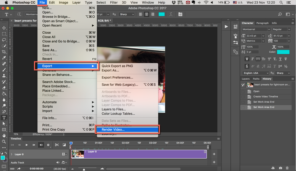 Choose the size that's appropriate for the video system on which the image will be shown. The document opened to show the timeline with the video layer added by default. Click advanced to specify a color profile and specific pixel aspect ratio. Photoshop will open all layers in the timeline panel and add an audio layer. Select 'video frames to layers' option under the import option of the file menu. Open a video file choose file > open, select a video file, and click open. The second method is to locate the right side of the timeline area, press the menu icon, and choose render video. It will have options in a drop down box to select or you can have a custom number of your choosing, ok. To create a folder to contain your exported file, select the create new subfolder option and enter a name for the subfolder. To shorten a video clip, drag on the end or the beginning. The video will also open if you drag the video file directly into photoshop. If the timeline does not open for you right away, choose window > timeline. Alternatively, head to window > workspace >.